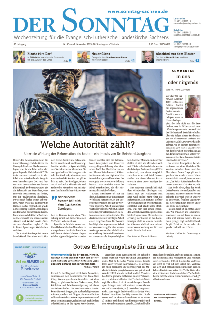 Eine neue Glaubensserie in den mitteldeutschen Kirchenzeitungen »Der Sonntag« aus Leipzig und »Glaube+Heimat« aus Weimar beschäftigt sich ab Ostern 2025 mit den 50 wichtigsten Bibeltexten.